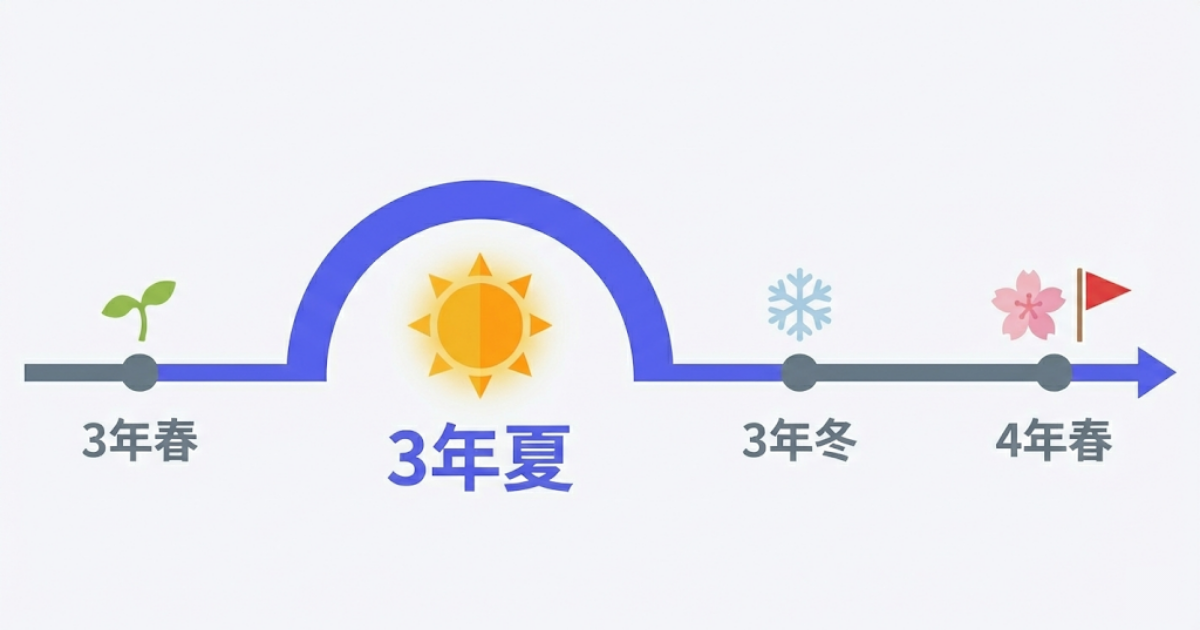 2026年2月現在、多くの28卒学生は大学2年生の終わりを迎えていて、4月からはいよいよ3年生です。ただ企業の時計はもっと先を指していて、外資系やベンチャーを中心に3年春からサマーインターンの募集が始まり、6月には選考が本格化します。夏休みにインターン本番を迎え、動きの早い企業では3年の秋にもう内定を出すこともあります。