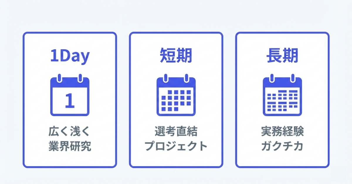 半日〜1日で完結するプログラムです。会社説明や簡単なワークショップが中心で、業界研究の入り口として気軽に参加できます。選考がないものも多く、まだ就活の方向性が固まっていない人にもおすすめです。