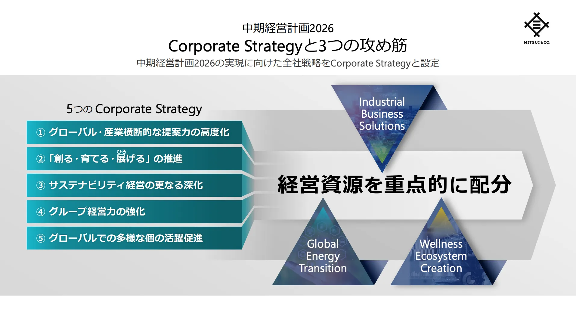 三井物産の成長戦略は、世界的な環境変化を機会として捉え、未来の産業を自ら創り出していくことを目指す挑戦的な方針です。中期経営計画によると「Industrial Business Solutions」「Global Energy Transition」「Wellness Ecosystem Creation」の3領域に重点を置き、2.3兆円規模の成長投資を進めています。