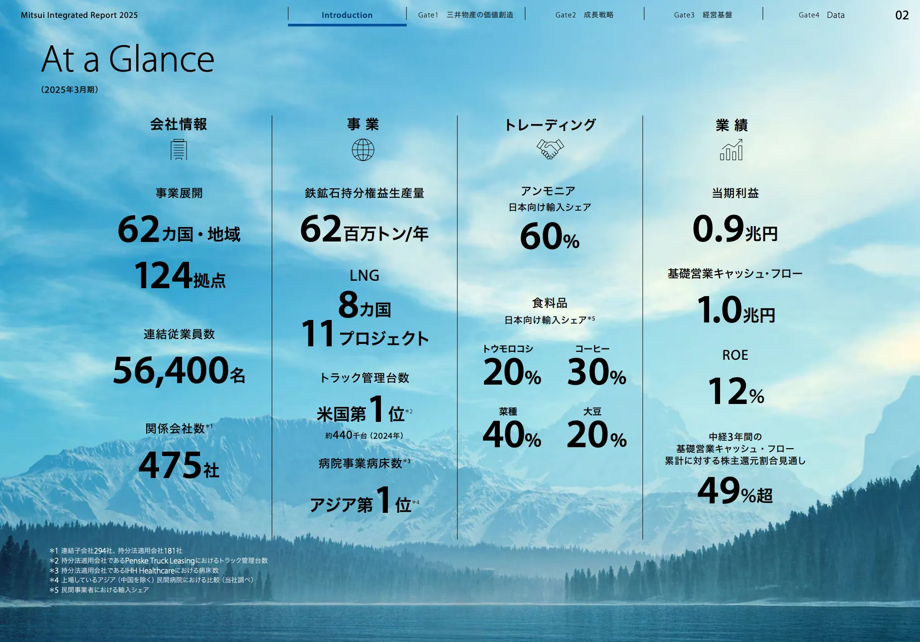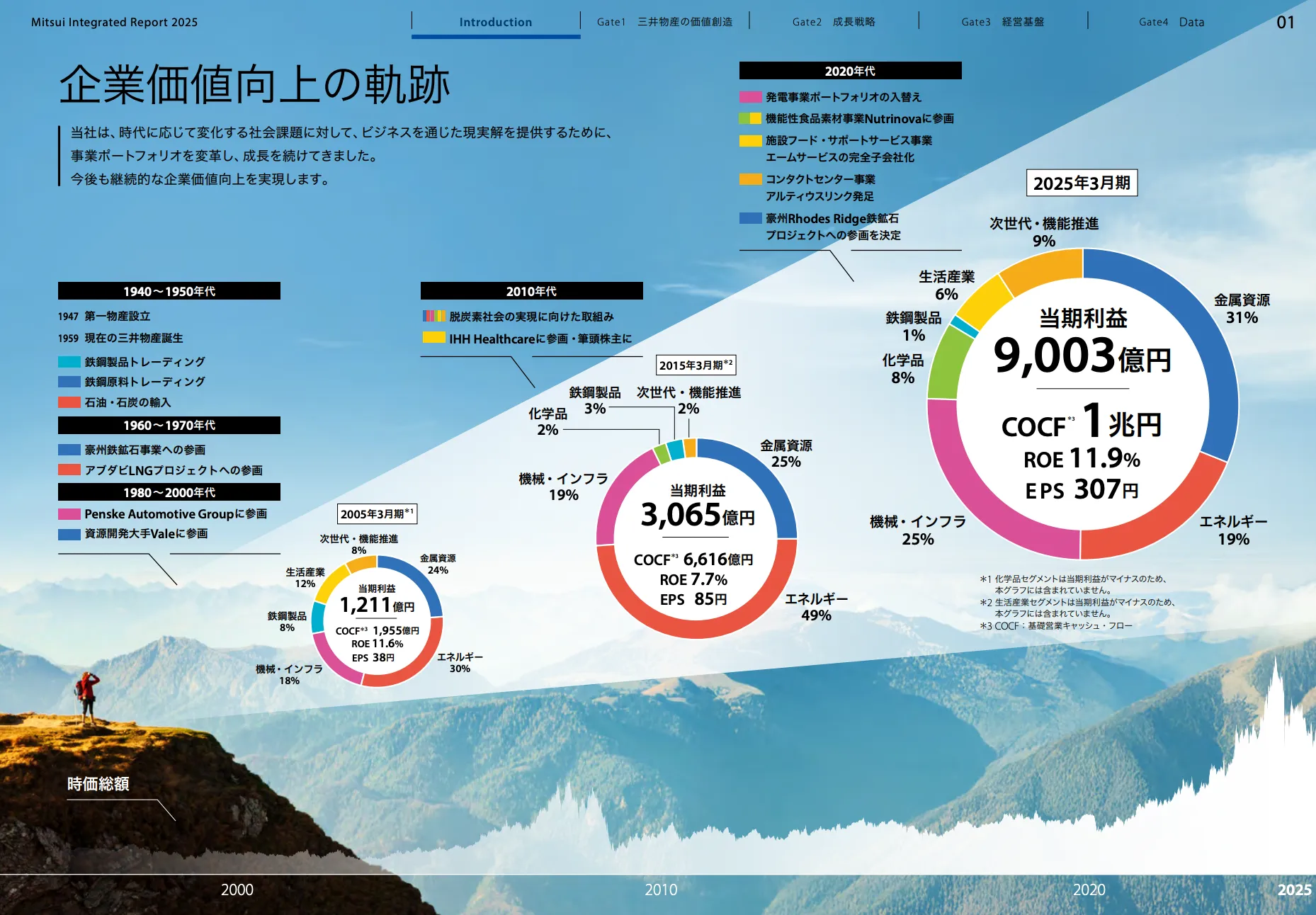 三井物産の文化は、統合報告書のCEOメッセージで表現されているように、「挑戦と創造」そして「自由闊達」を中核に据えています。同社には、常に新しい領域に挑み、自ら価値を創り出してきた歴史があります。例えば資源分野では、誰もが成功を確信できる前から海外の大型鉱山開発に踏み込み、数十年単位で収益を生み出す事業へと育て上げました。このような長期視点での投資と価値創造の蓄積は、単なる偶然や運ではなく、企業文化としての挑戦精神が支えてきたものです。
