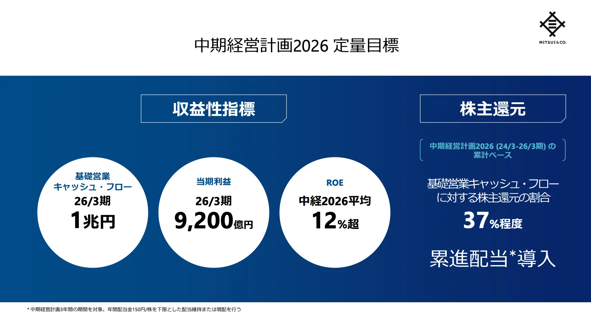 統合報告書では、投資後の収益化を当初計画より前倒しで進めていると明記されており、FPSO、洋上風力、排出権、天然ガス、次世代燃料、アニマルヘルス、モビリティなどの複数案件が2024〜2027年に成果を生む予定です。これにより、基礎営業キャッシュフロー1兆円、当期利益9,200億円、ROE12%以上という中期目標の達成を目指しています。
