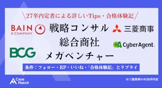 本記事では、戦略コンサルティングファーム(ベイン・アンド・カンパニー、ボストン・コンサルティング・グループ)、総合商社(三菱商事)、メガベンチャー(サイバーエージェント)の選考対策について、実際の内定者の体験談と詳細な選考Tipsをまとめています。