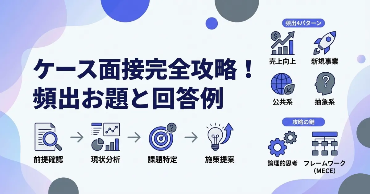 ケース面接には、大きく分けて主要4パターンのお題が存在します。ここでは、それぞれのパターンの特徴と解き方のポイント、さらに実際に出題されたお題例を交えながら解説します。