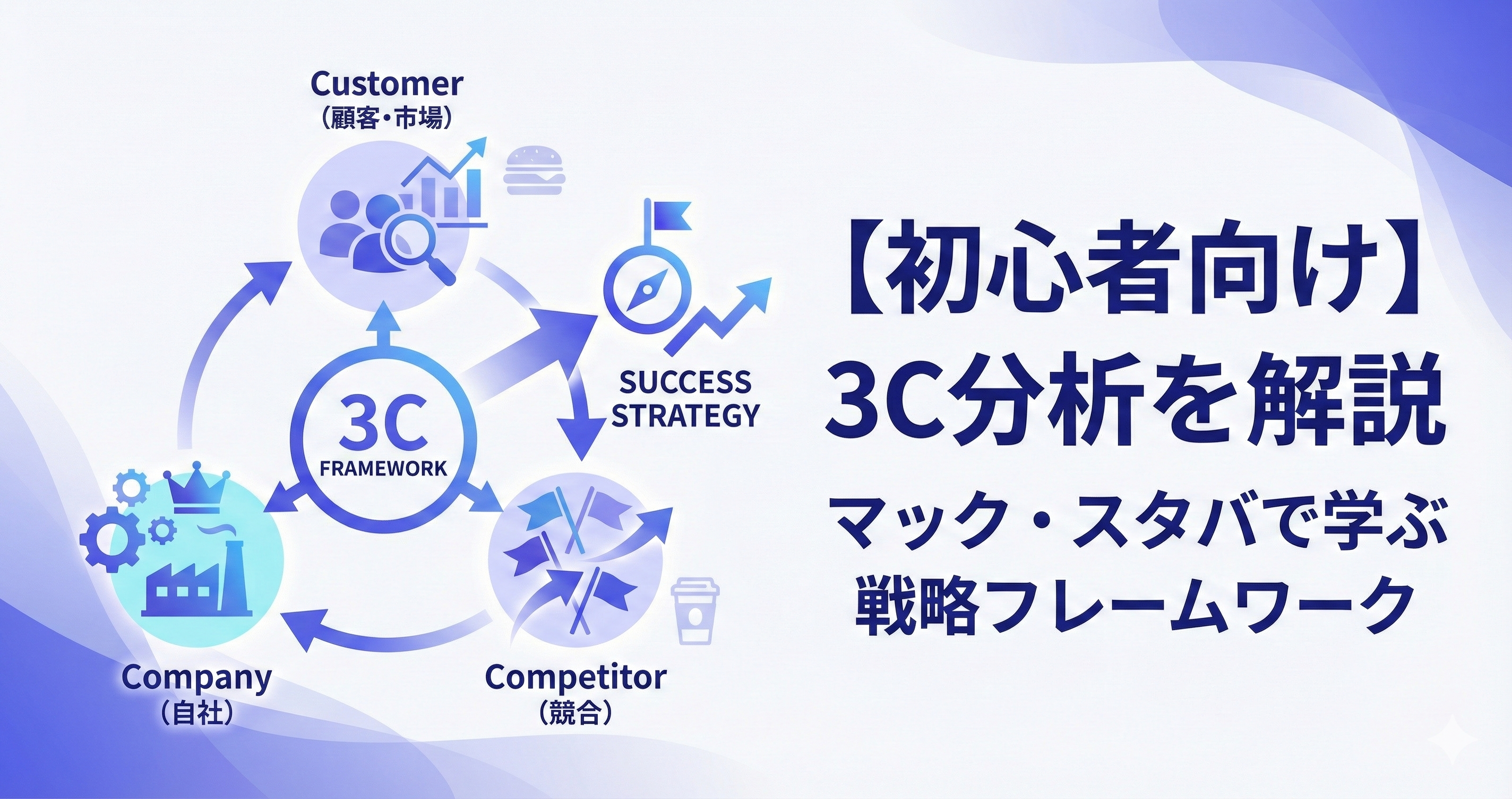 マーケティングにおける最重要フレームワークのひとつが「3C分析」です。市場で勝ち抜くための戦略を立てるうえで、自社だけでなく、顧客(Customer)・自社(Company)・競合(Competitor)という3つの視点から環境を把握することが不可欠です。企業の経営戦略から商品開発、広告戦略に至るまで、あらゆる意思決定の基礎となるフレームワークとして幅広く使われています。