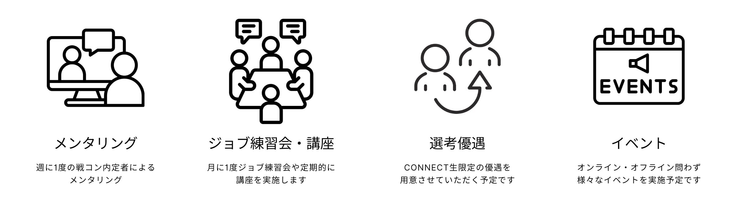 CONNECTは、単なる就活対策にとどまらず、“横”の仲間との切磋琢磨と、“縦”の先輩方との長期的な繋がりを軸に、参加者一人ひとりの可能性を最大化することを目的としています。メンタリング、ケース対策、ジョブ練習会といった学びの機会を体系的に提供し、戦略コンサル内定というゴールに向けて徹底的に伴走します。