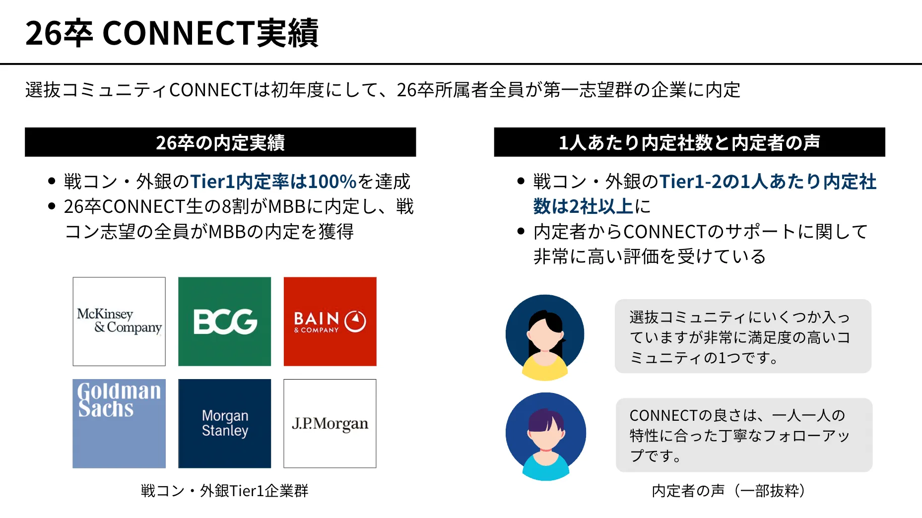 CONNECTの26卒生は、Tier1〜Tier2の戦略コンサルティングファームにおいて、1人あたり平均1.8社内定という圧倒的な成果を残しました。27卒に関しては、冬選考が終わり次第掲載予定です。