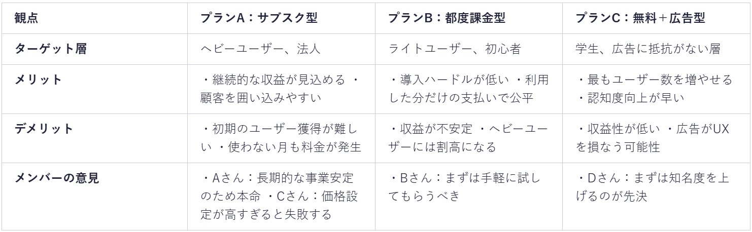 - 議論の俯瞰: 全員の目に見える形で記録を残すことで、チームがいつでも議論の全体像に立ち返り、論点の漏れや重複を防ぐことができます。