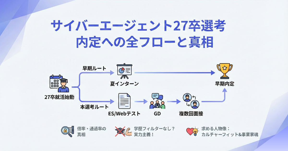 サイバーエージェントの27卒向けビジネス職本選考は、「前期」「後期」「終期」の3つの期間に分かれて実施されます。