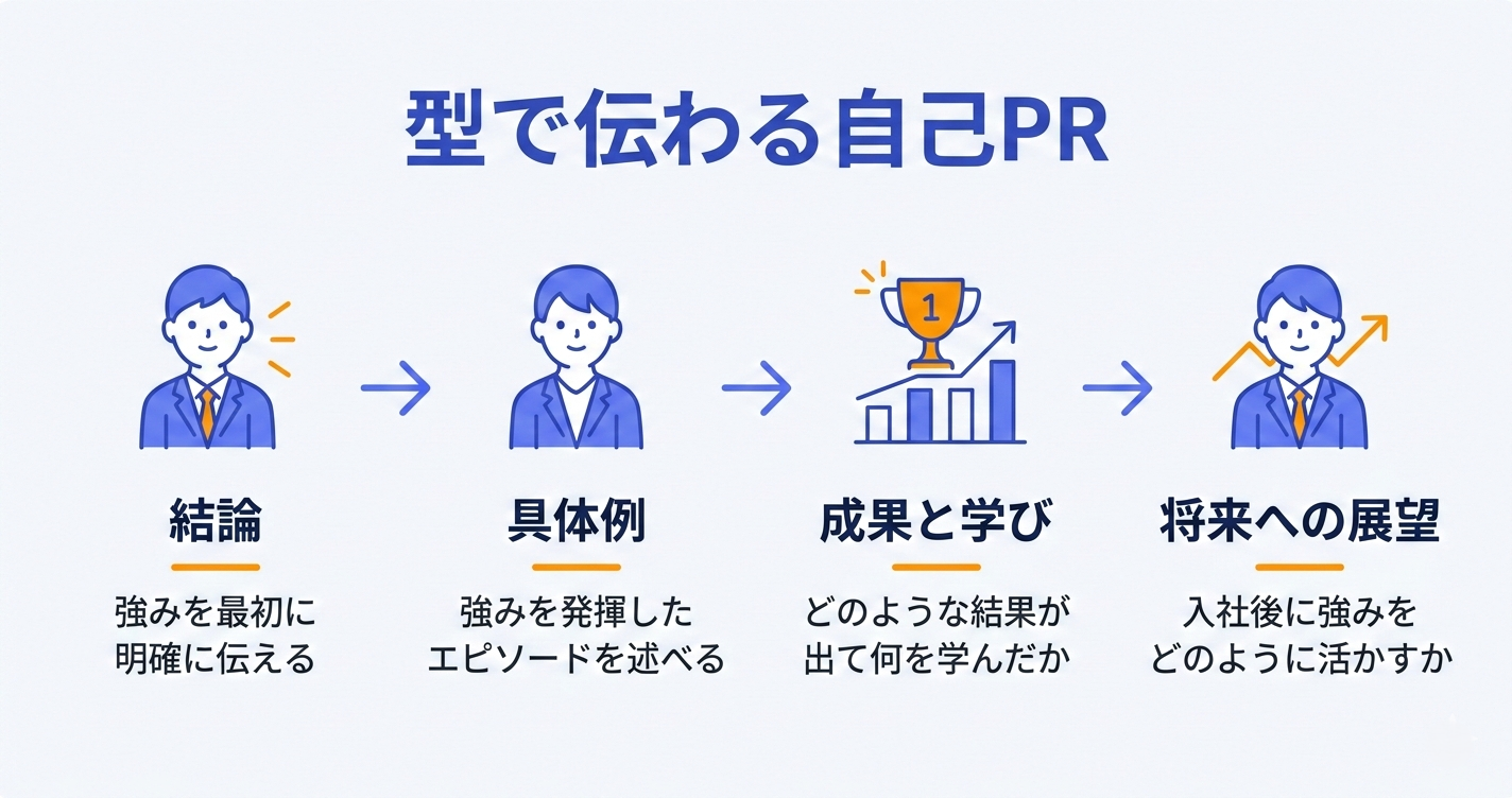 PREP法をベースにした自己PRの基本構成は、次の4つのパートで成り立ちます。