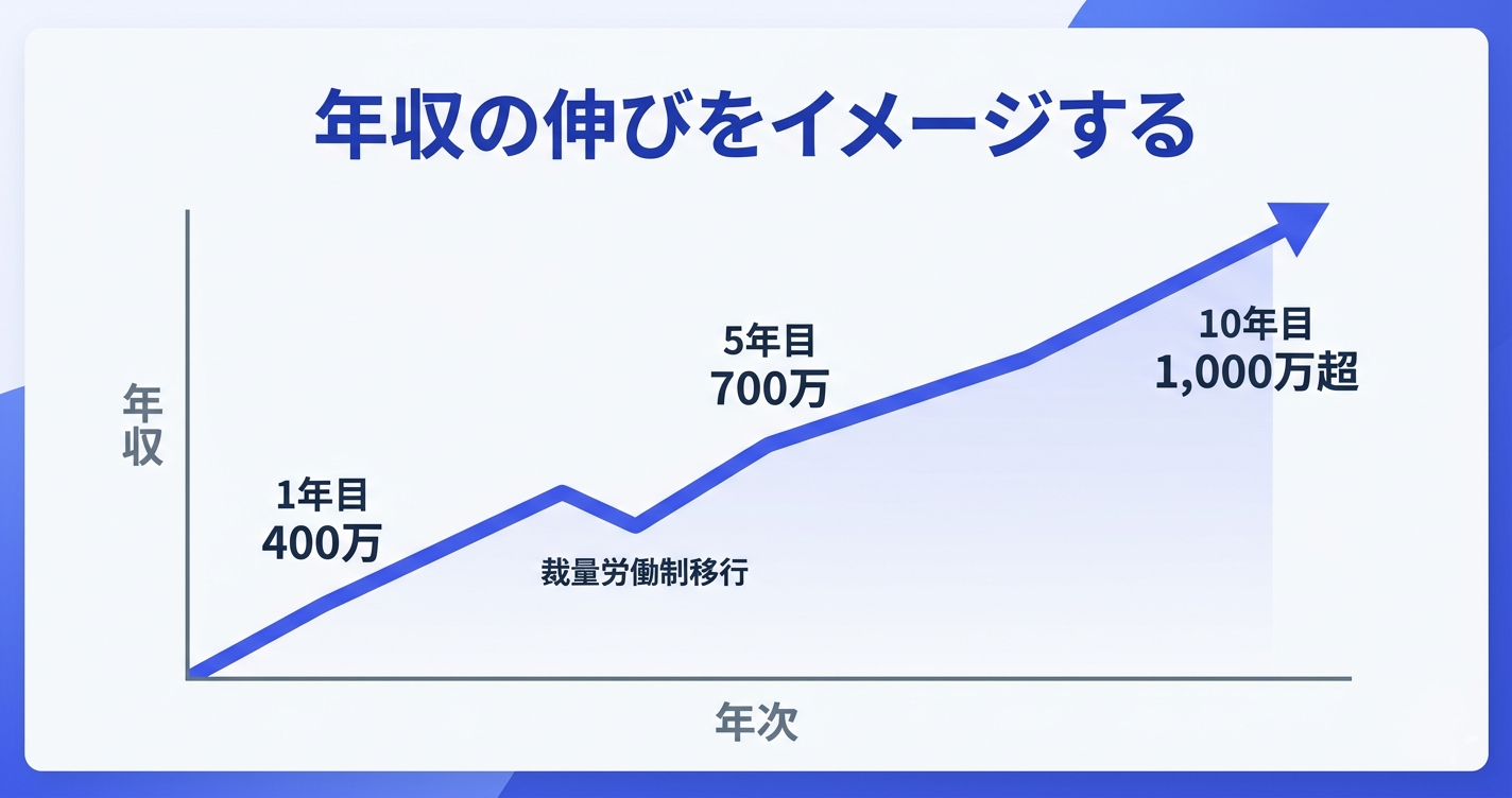 4年目の裁量労働制移行で残業代がなくなり、一時的に年収が下がったように感じることがあります。ただし基本給自体は上昇するため、中長期では年収は右肩上がりを続けます。