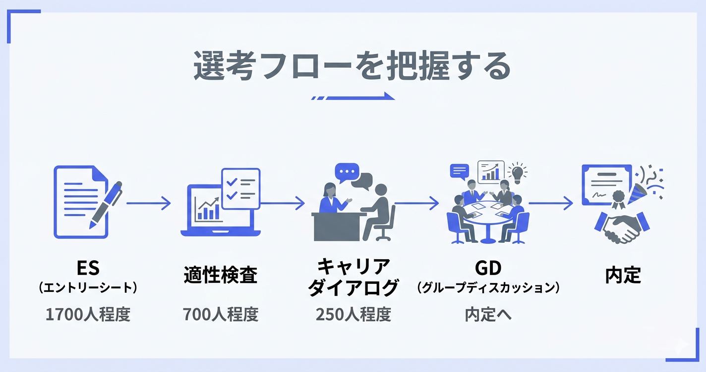 選考フローの概要(ES→適性検査→キャリアディスカッション→GD→内定)