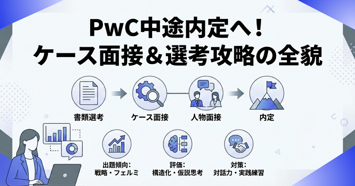 特に中途採用では、「これまでの経験をどう捉え、どう活かすか」という視点と、「PwCという場で、どのように貢献しようとしているか」が一貫して見られます。そのため、自己分析とケース練習の両輪で準備を進めることが、突破への最短ルートとなります。