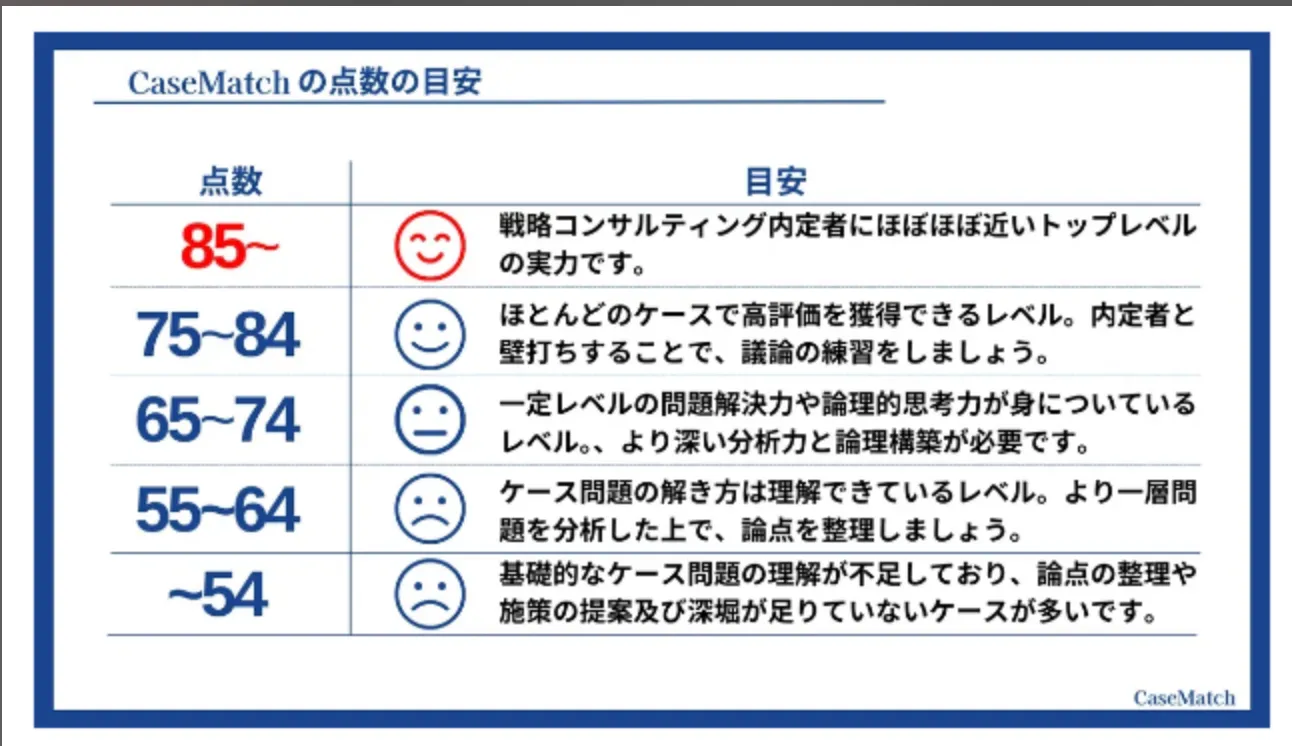 エントリーシートからオンラインテスト、複数回にわたる面接まで、各ステップで求められるスキルは異なるため、段階的かつ実践的なトレーニングが不可欠です。Casematchで実践的なトレーニングを重ねましょう。Casematchの点数の基準は以下になります。参考にしてトレーニングを積んでくださいね。