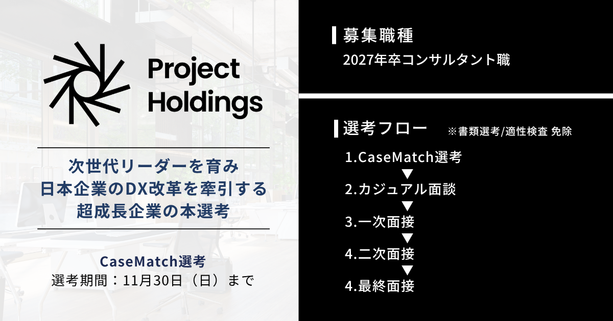 弊社は、「プロジェクト型社会の創出」をミッションに、DX領域のコンサルティング事業を中心に、戦略立案から実行支援まで一気通貫で行うプロフェッショナル集団です。 現在は事業拡大フェーズにあり、生成AIなどの先端領域での新規事業開発にも積極的に取り組んでいます。 「100億×100事業構想」のもと、上場企業として次々と新しい挑戦を仕掛けています。 自らが次世代を率いるプロフェッショナル人材を志す方は、奮ってご応募ください。